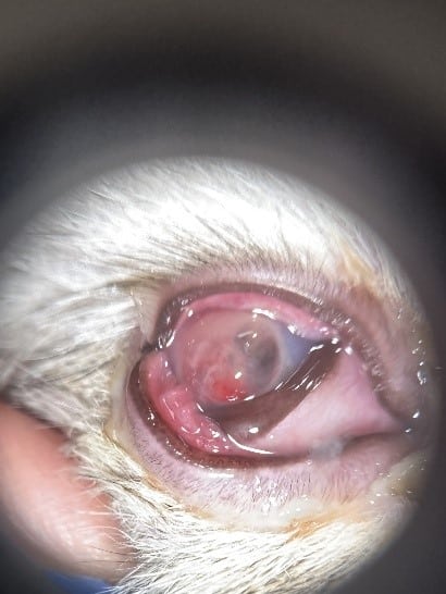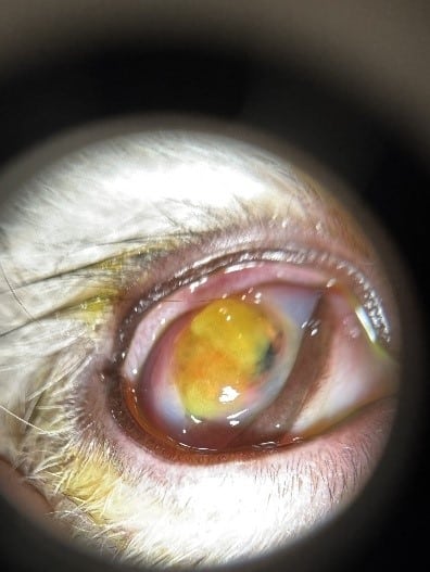 OD: The right eye exhibited moderate blepharospasm, palpebral and bulbar conjunctival hyperemia with chemosis and mucoid to mucopurulent discharge. The third eyelid was moderately elevated and hyperemic. There was a large, corneal perforation with uveal prolapse and vascular tissue plugging the defect. There was a ring of purulent, white, malacic corneal stromal infiltrate and neovascularization surrounding the rupture. There was moderate pan stromal edema. Intraocular examination was limited due to corneal disease.