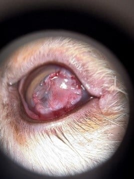 Figure 5: OD healthy vascular graft 13 days post-surgery. The corneal edema/keratitis is greatly improving. An area of granulation tissue can be seen temporally associated with healing of the graft harvest site.